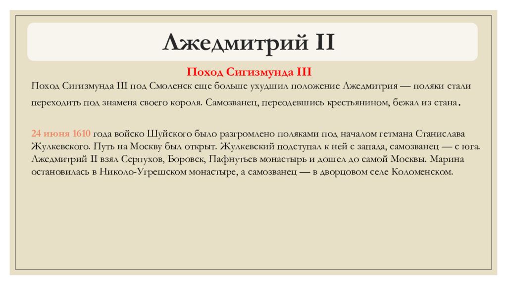Поход Сигизмунда III Поход Сигизмунда III под Смоленск еще больше ухудшил положение Лжедмитрия — поляки стали переходить под знамена своего короля. Самозванец, переодевшись крестьянином, бежал из стана. 24 июня 1610 года войско Шуйского было разгромлено поляками под началом гетмана Станислава Жулкевского. Путь на Москву был открыт. Жулкевскии ̆ подступал к неи ̆ с запада, самозванец — с юга. Лжедмитрий II взял Серпухов, Боровск, Пафнутьев монастырь и дошел до самои ̆ Москвы. Марина остановилась в Николо-Угрешском монастыре, а самозванец — в дворцовом селе Коломенском. Лжедмитрий II