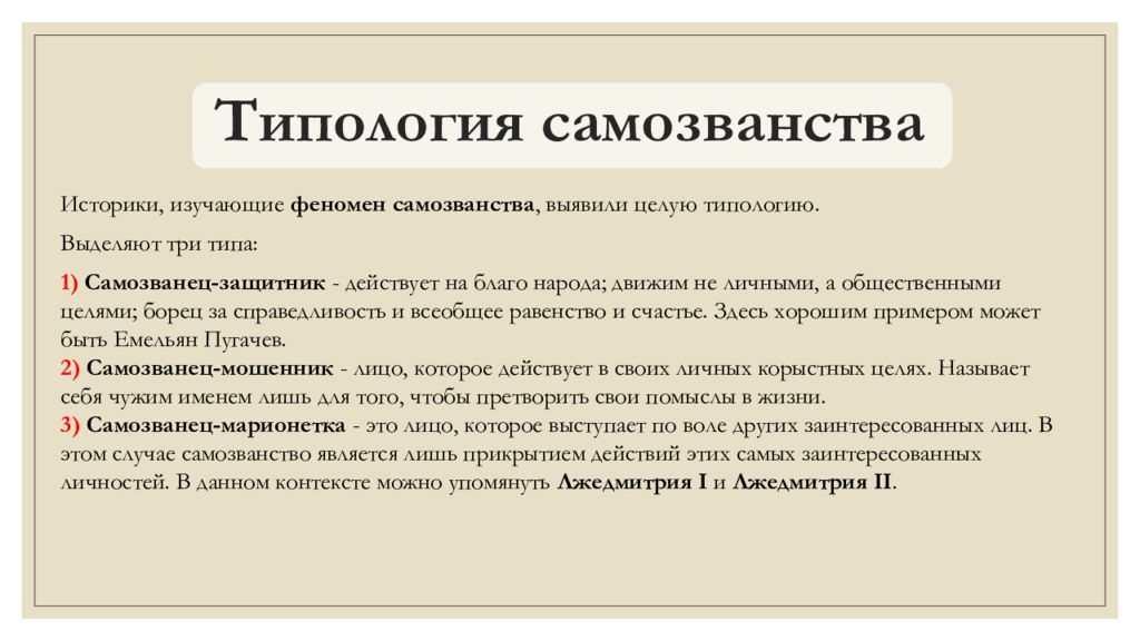Историки, изучающие феномен самозванства, выявили целую типологию. Выделяют три типа: 1) Самозванец-защитник - действует на благо народа; движим не личными, а общественными целями; борец за справедливость и всеобщее равенство и счастье. Здесь хорошим примером может быть Емельян Пугачев. 2) Самозванец-мошенник - лицо, которое действует в своих личных корыстных целях. Называет себя чужим именем лишь для того, чтобы претворить свои помыслы в жизни. 3) Самозванец-марионетка - это лицо, которое выступает по воле других заинтересованных лиц. В этом случае самозванство является лишь прикрытием действий этих самых заинтересованных личностей. В данном контексте можно упомянуть Лжедмитрия I и Лжедмитрия II.