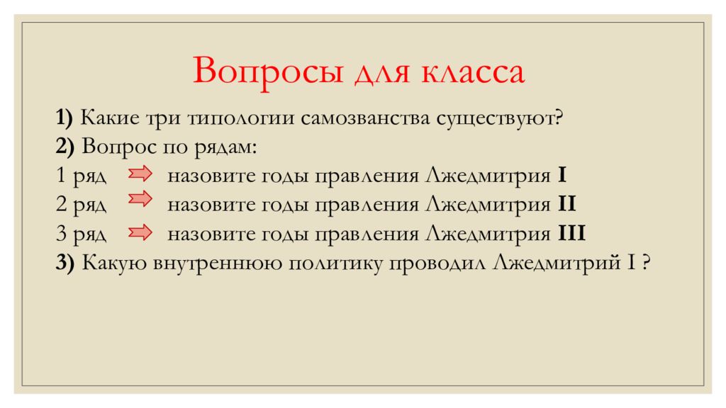 1) Какие три типологии самозванства существуют? 2) Вопрос по рядам: 1 ряд назовите годы правления Лжедмитрия I 2 ряд назовите годы правления Лжедмитрия II 3 ряд назовите годы правления Лжедмитрия III 3) Какую внутреннюю политику проводил Лжедмитрий I ?