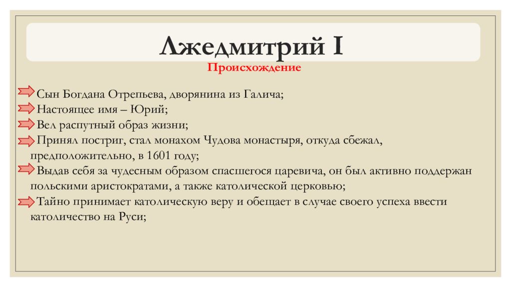 Происхождение Сын Богдана Отрепьева, дворянина из Галича; Настоящее имя – Юрий; Вел распутный образ жизни; Принял постриг, стал монахом Чудова монастыря, откуда сбежал, предположительно, в 1601 году; Выдав себя за чудесным образом спасшегося царевича, он был активно поддержан польскими аристократами, а также католической церковью; Тайно принимает католическую веру и обещает в случае своего успеха ввести католичество на Руси; Лжедмитрий I