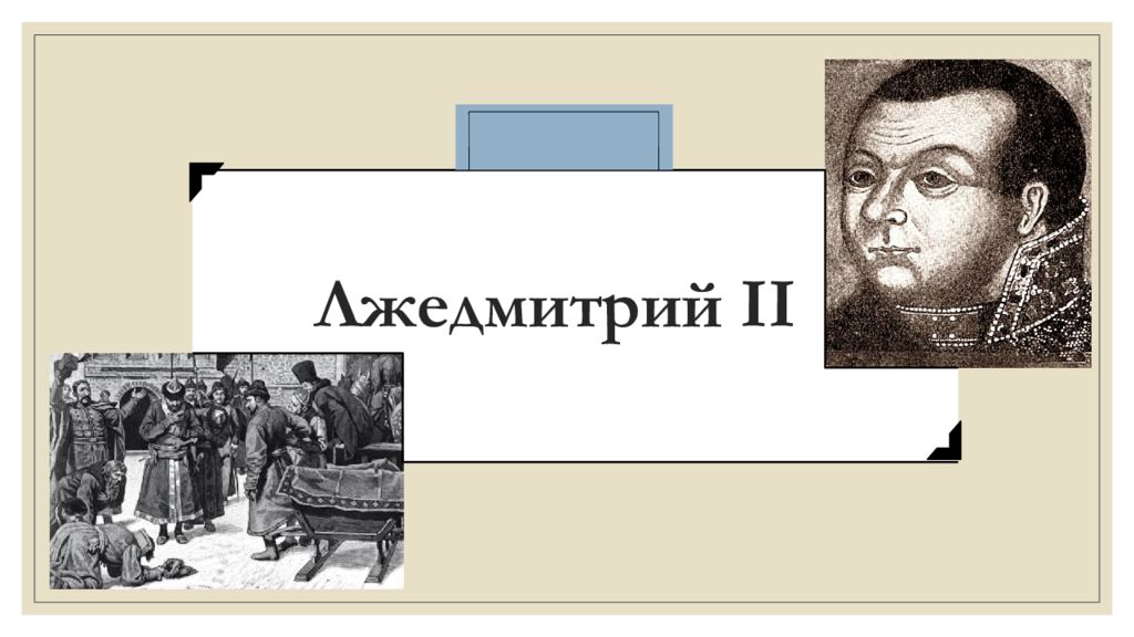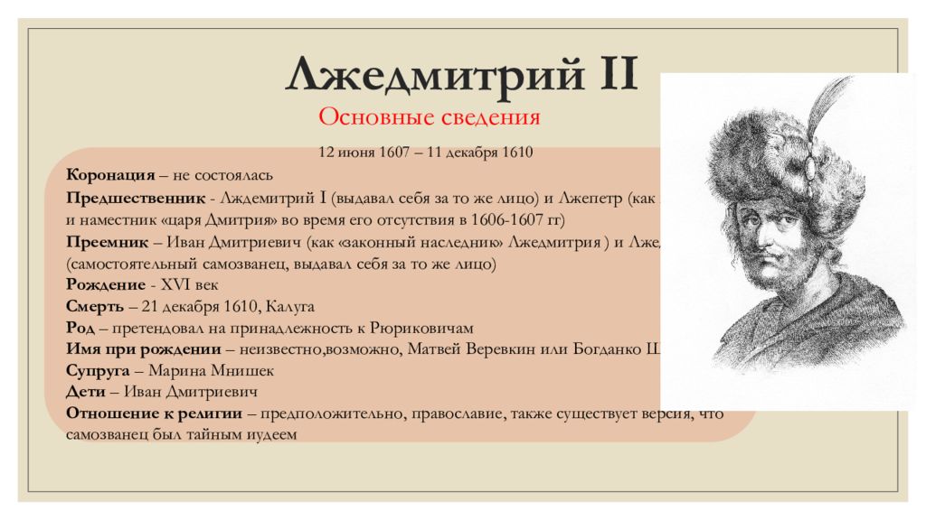 Основные сведения 12 июня 1607 – 11 декабря 1610 Коронация – не состоялась Предшественник - Лждемитрий I (выдавал себя за то же лицо) и Лжепетр (как племянник и наместник «царя Дмитрия» во время его отсутствия в 1606-1607 гг ) Преемник – Иван Дмитриевич (как «законный наследник» Лжедмитрия ) и Лжедмитрий III (самостоятельный самозванец, выдавал себя за то же лицо) Рождение - XVI век Смерть – 21 декабря 1610, Калуга Род – претендовал на принадлежность к Рюриковичам Имя при рождении – неизвестно, возможно, Матвей Веревкин или Богданко Шкловский Супруга – Марина Мнишек Дети – Иван Дмитриевич Отношение к религии – предположительно, православие, также существует версия, что самозванец был тайным иудеем Лжедмитрий II