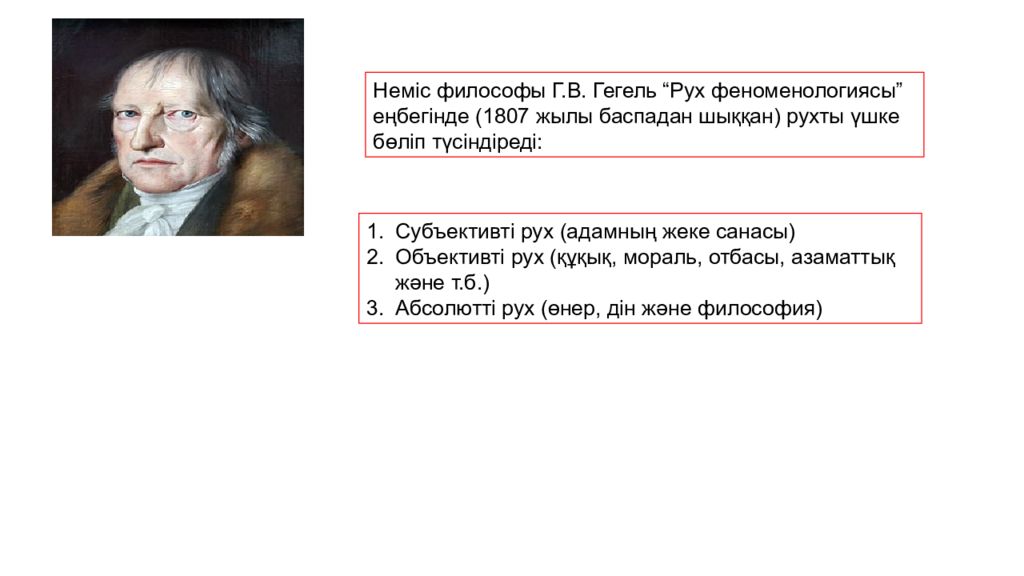 Неміс философы Г.В. Гегель “Рух феноменологиясы” еңбегінде ( 1807 жылы баспадан шыққан) рухты үшке бөліп түсіндіреді: Субъективті рух (адамның жеке санасы) Объективті рух (құқық, мораль, отбасы, азаматтық және т.б.) Абсолютті рух (өнер, дін және философия)