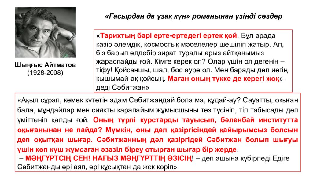 « Тарихтың бәрі ерте-ертедегі ертек қой. Бұл арада қазір әлемдік, космостық мәселелер шешіліп жатыр. Ал, біз барып әлдебір зират туралы арыз айтқанымыз жараспайды ғой. Кімге керек ол? Олар үшін ол дегенін – тіфу! Қойсаңшы, шал, бос әуре ол. Мен барады деп иегің қышымай-ақ қойсың. Маған оның түкке де керегі жоқ » - деді Сәбитжан» «Ақыл сұрап, көмек күтетін адам Сәбитжандай бола ма, құдай-ау? Сауатты, оқыған бала, мұндайлар мен сияқты қарапайым жұмысшыны тез түсініп, тіл табысады деп үміттеніп қалды ғой. Оның түрлі курстарды тауысып, бәленбай институтта оқығанынан не пайда? Мүмкін, оны дәл қазіргісіндей қайырымсыз болсын деп оқытқан шығар. Сәбитжанның дәл қазіргідей Сәбитжан болып шығуы үшін көп күш жұмсаған әзәзіл біреу отырған шығар бір жерде. – МӘҢГҮРТСІҢ СЕН! НАҒЫЗ МӘҢГҮРТТІҢ ӨЗІСІҢ ! – деп ашына күбірледі Едіге Сәбитжанды әрі аяп, әрі құсықтан да жек көріп» Шыңғыс Айтматов (1928-2008) «Ғасырдан да ұзақ күн» романынан үзінді сөздер