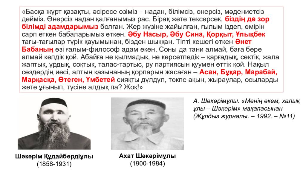 «Басқа жұрт қазақты, әсіресе өзіміз – надан, білімсіз, өнерсіз, мәдениетсіз дейміз. Өнерсіз надан қалғанымыз рас. Бірақ жете тексерсек, біздің де зор білімді адамдарымыз болған. Жер жүзіне жайылған, ғылым іздеп, өмірін сарп еткен бабаларымыз өткен. Әбу Насыр, Әбу Сина, Қорқыт, Ұлықбек тағы-тағылар түрік қауымынан, бізден шыққан. Тіпті кешегі өткен Әнет Бабаның өзі ғалым-философ адам екен. Соны да тани алмай, баға бере алмай келдік қой. Абайға не қылмадық, не көрсетпедік – қарғадық, сөктік, жала жаптық, ұрдық, соқтық, талас-тартыс, ру партиясын қуумен өттік қой. Нақыл сөздердің иесі, алтын қазынаның қорларын жасаған – Асан, Бұқар, Марабай, Марқасқа, Өтеген, Үмбетей сияқты дүлдүл, төкпе ақын, жыраулар, осыларды жете ұғынып, түсіне алдық па? Жоқ!» А. Шәкәрімұлы. «Менің әкем, халық ұлы – Шәкерім» мақаласынан (Жұлдыз журналы. – 1992. – №11) Ахат Шәкәрімұлы (1900-1984) Шәкәрім Құдайбердіұлы (1858-1931)