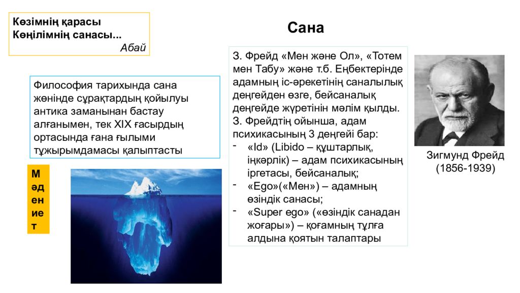 Философия тарихында сана жөнінде сұрақтардың қойылуы антика заманынан бастау алғанымен, тек ХІХ ғасырдың ортасында ғана ғылыми тұжырымдамасы қалыптасты Зигмунд Фрейд (1856-1939) З. Фрейд «Мен және Ол», «Тотем мен Табу» және т.б. Еңбектерінде адамның іс-әрекетінің саналылық деңгейден өзге, бейсаналық деңгейде жүретінін мәлім қылды. З. Фрейдтің ойынша, адам психикасының 3 деңгейі бар: « Id » ( Libido – құштарлық, іңкәрлік) – адам психикасының іргетасы, бейсаналық ; « Ego »(«Мен») – адамның өзіндік санасы; « Super ego » («өзіндік санадан жоғары») – қоғамның тұлға алдына қоятын талаптары Мәдениет Көзімнің қарасы Көңілімнің санасы... Абай