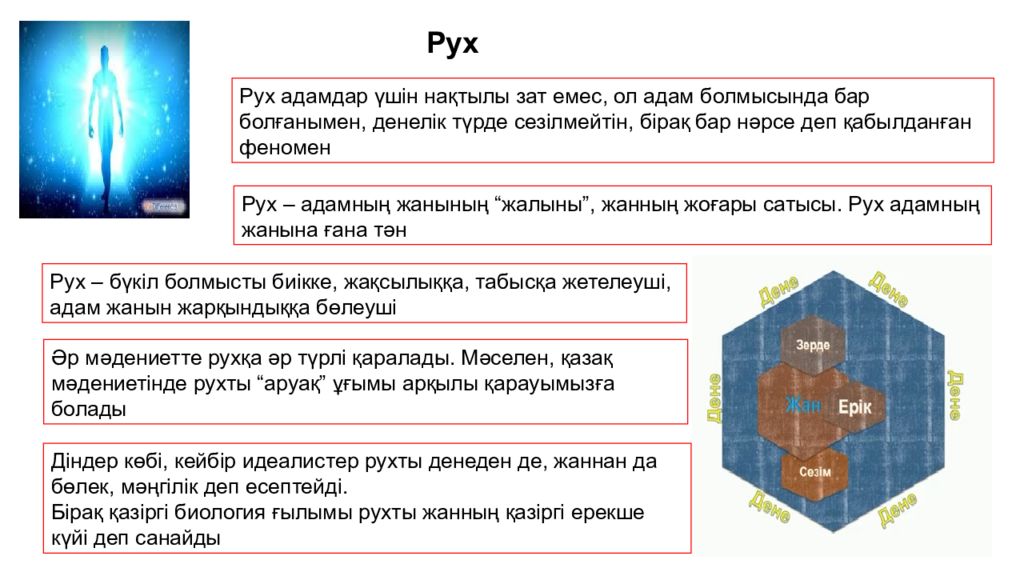 Рух адамдар үшін нақтылы зат емес, ол адам болмысында бар болғанымен, денелік түрде сезілмейтін, бірақ бар нәрсе деп қабылданған феномен Рух – адамның жанының “жалыны”, жанның жоғары сатысы. Рух адамның жанына ғана тән Рух – бүкіл болмысты биікке, жақсылыққа, табысқа жетелеуші, адам жанын жарқындыққа бөлеуші Әр мәдениетте рухқа әр түрлі қаралады. Мәселен, қазақ мәдениетінде рухты “аруақ” ұғымы арқылы қарауымызға болады Діндер көбі, кейбір идеалистер рухты денеден де, жаннан да бөлек, мәңгілік деп есептейді. Бірақ қазіргі биология ғылымы рухты жанның қазіргі ерекше күйі деп санайды