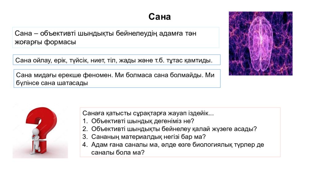 Сана – объективті шындықты бейнелеудің адамға тән жоғарғы формасы Санаға қатысты сұрақтарға жауап іздейік... Объективті шындық дегеніміз не? Объективті шындықты бейнелеу қалай жүзеге асады? Сананың материалдық негізі бар ма ? Адам ғана саналы ма, әлде өзге биологиялық түрлер де саналы бола ма? Сана ойлау, ерік, түйсік, ниет, тіл, жады және т.б. тұтас қамтиды. Сана мидағы ерекше феномен. Ми болмаса сана болмайды. Ми бүлінсе сана шатасады