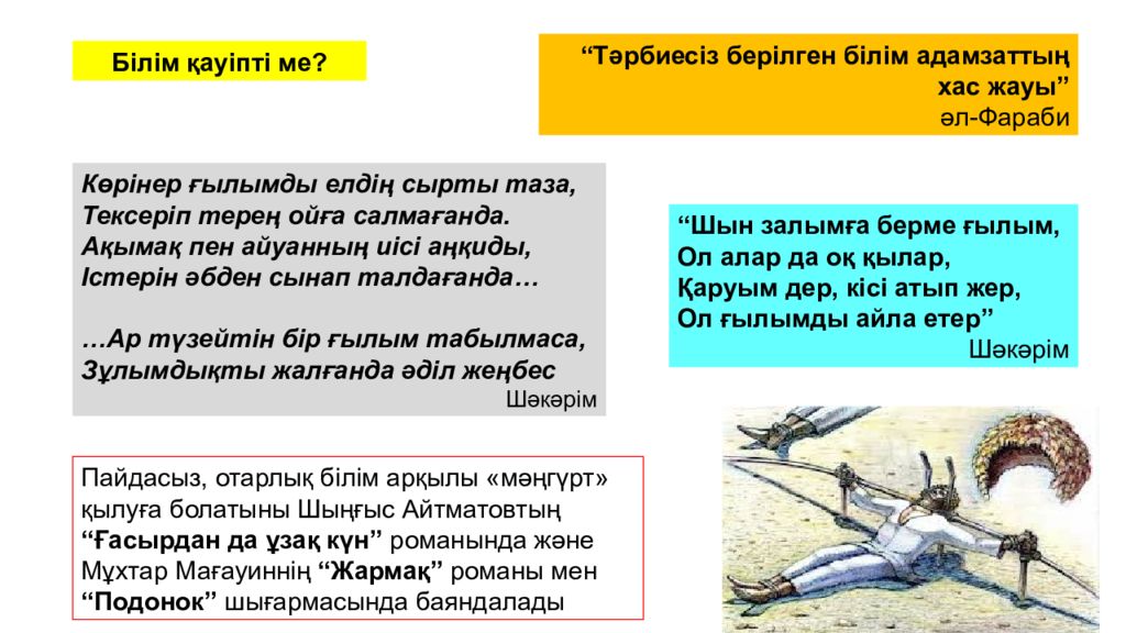 Білім қауіпті ме? “Тәрбиесіз берілген білім адамзаттың хас жауы” әл-Фараби Пайдасыз, отарлық білім арқылы «мәңгүрт» қылуға болатыны Шыңғыс Айтматовтың “Ғасырдан да ұзақ күн” романында және Мұхтар Мағауиннің “Жармақ” романы мен “Подонок” шығармасында баяндалады “Шын залымға берме ғылым, Ол алар да оқ қылар, Қаруым дер, кісі атып жер, Ол ғылымды айла етер” Шәкәрім Көрінер ғылымды елдің сырты таза, Тексеріп терең ойға салмағанда. Ақымақ пен айуанның иісі аңқиды, Істерін ə бден сынап талдағанда … …Ар түзейтін бір ғылым табылмаса, Зұлымдықты жалғанда ə діл жеңбес Шәкәрім