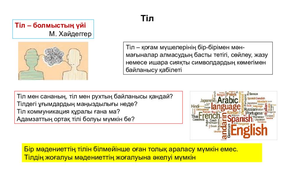 Тіл Тіл – қоғам мүшелерінің бір-бірімен мән-мағыналар алмасудың басты тетігі, сөйлеу, жазу немесе ишара сияқты символдардың көмегімен байланысу қабілеті Бір мәдениеттің тілін білмейінше оған толық араласу мүмкін емес. Тілдің жоғалуы мәдениеттің жоғалуына әкелуі мүмкін Тіл – болмыстың үйі М. Хайдеггер Тіл мен сананың, тіл мен рухтың байланысы қандай? Тілдегі ұғымдардың маңыздылығы неде? Тіл коммуникация құралы ғана ма? Адамзаттың ортақ тілі болуы мүмкін бе?