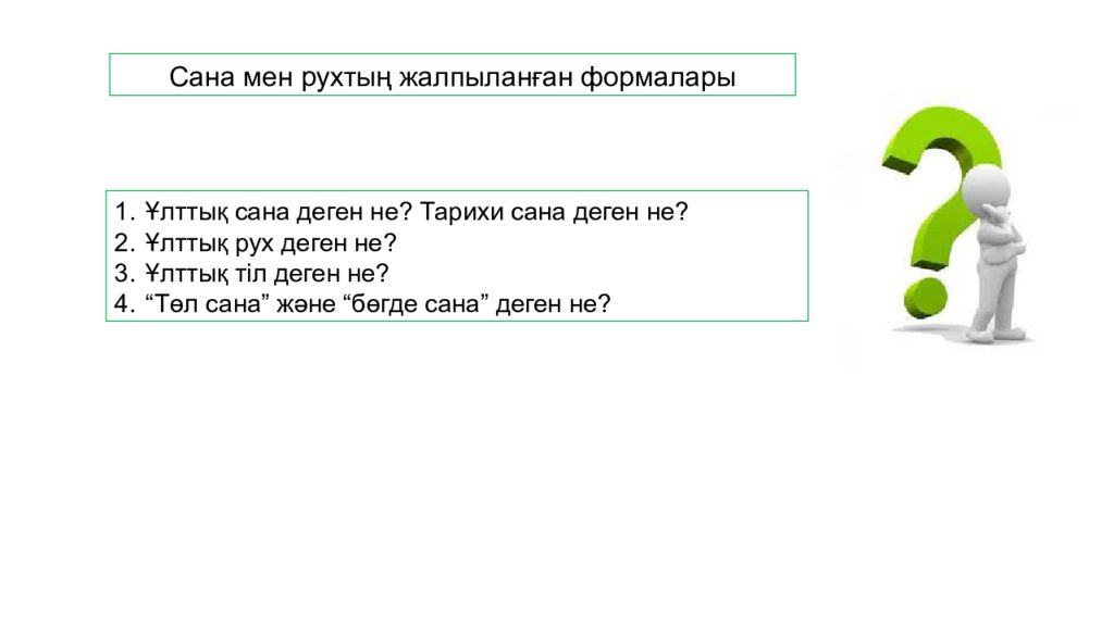 Сана мен рухтың жалпыланған формалары Ұлттық сана деген не? Тарихи сана деген не? Ұлттық рух деген не? Ұлттық тіл деген не? “Төл сана” және “бөгде сана” деген не?