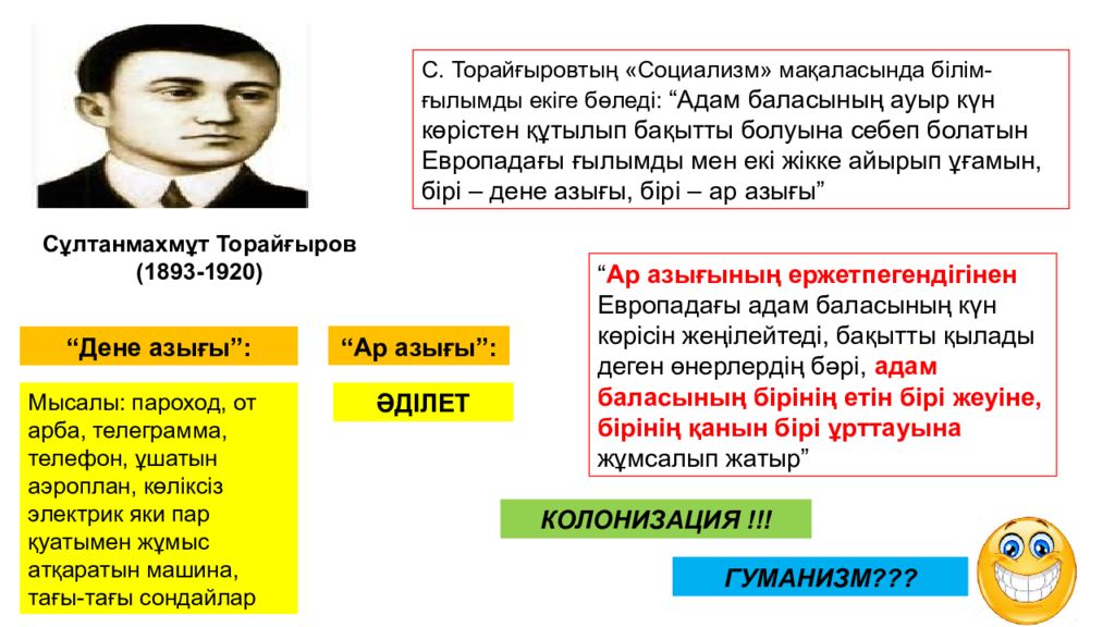 С. Торайғыровтың «Социализм» мақаласында білім-ғылымды екіге бөледі: “Адам баласының ауыр күн көрістен құтылып бақытты болуына себеп болатын Европадағы ғылымды мен екі жікке айырып ұғамын, бірі – дене азығы, бірі – ар азығы” “Дене азығы”: Мысалы: пароход, от арба, телеграмма, телефон, ұшатын аэроплан, көліксіз электрик яки пар қуатымен жұмыс атқаратын машина, тағы-тағы сондайлар “Ар азығы”: ӘДІЛЕТ “ Ар азығының ержетпегендігінен Европадағы адам баласының күн көрісін жеңілейтеді, бақытты қылады деген өнерлердің бәрі, адам баласының бірінің етін бірі жеуіне, бірінің қанын бірі ұрттауына жұмсалып жатыр” КОЛОНИЗАЦИЯ !!! ГУМАНИЗМ??? Сұлтанмахмұт Торайғыров (1893-1920)