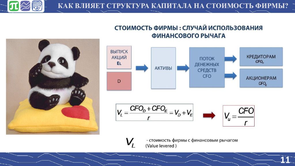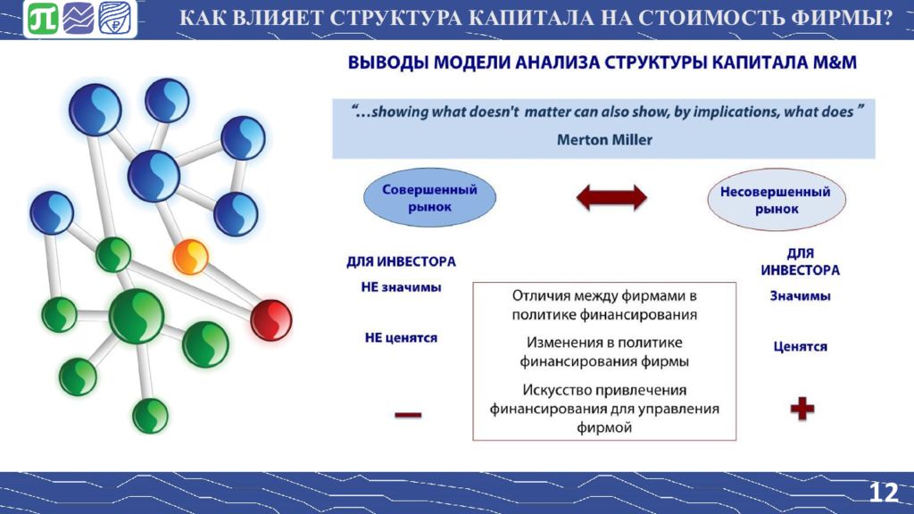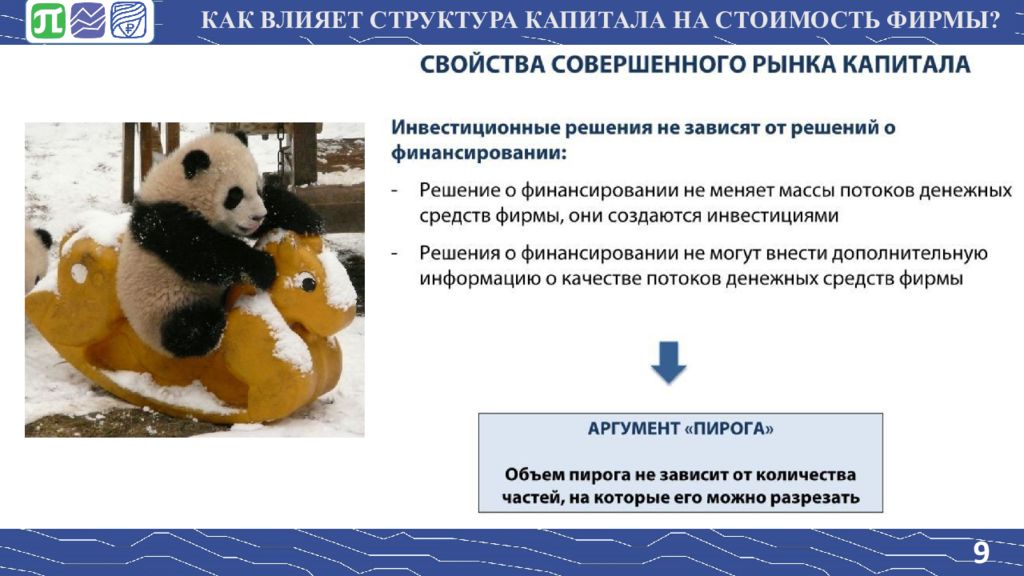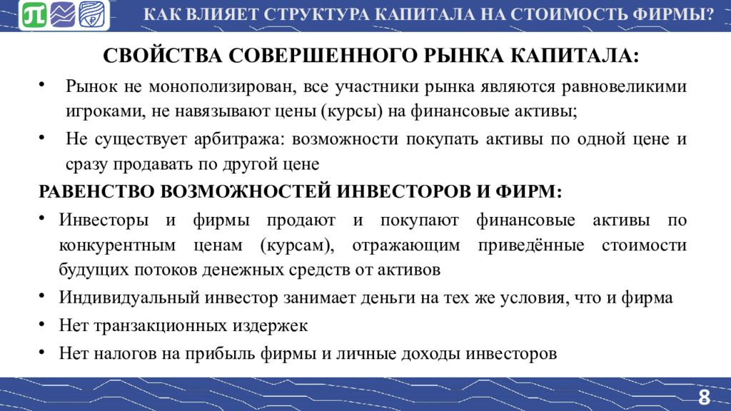 КАК ВЛИЯЕТ СТРУКТУРА КАПИТАЛА НА СТОИМОСТЬ ФИРМЫ? 8 СВОЙСТВА СОВЕРШЕННОГО РЫНКА КАПИТАЛА: Рынок не монополизирован, все участники рынка являются равновеликими игроками, не навязывают цены (курсы) на финансовые активы ; Не существует арбитража: возможности покупать активы по одной цене и сразу продавать по другой цене РАВЕНСТВО ВОЗМОЖНОСТЕЙ ИНВЕСТОРОВ И ФИРМ: Инвесторы и фирмы продают и покупают финансовые активы по конкурентным ценам (курсам), отражающим приведённые стоимости будущих потоков денежных средств от активов Индивидуальный инвестор занимает деньги на тех же условия, что и фирма Нет транзакционных издержек Нет налогов на прибыль фирмы и личные доходы инвесторов
