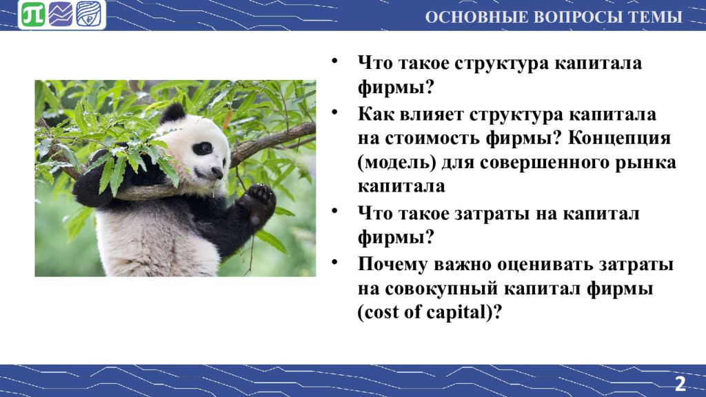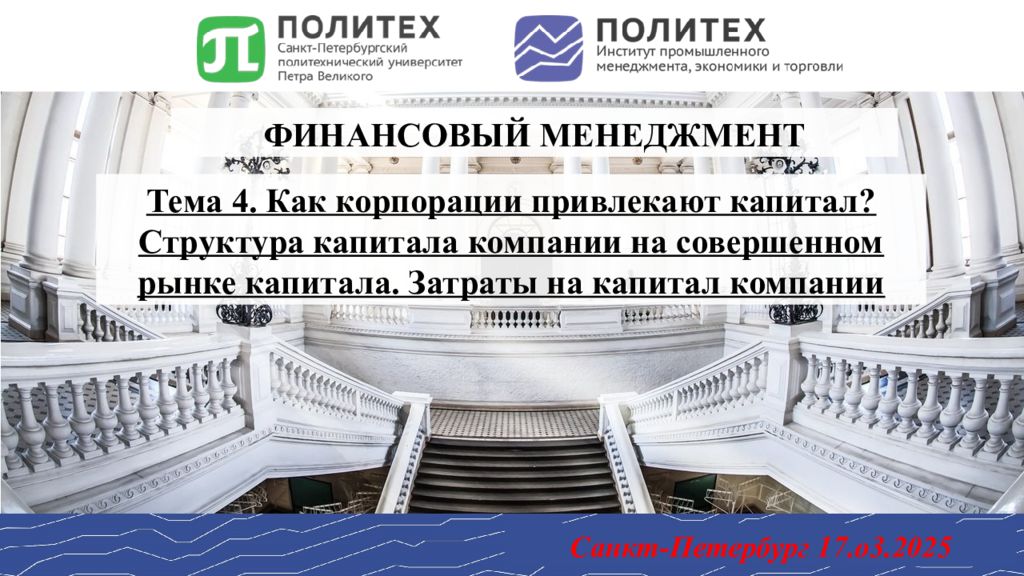 Санкт-Петербург 17.о3.2025 ФИНАНСОВЫЙ МЕНЕДЖМЕНТ Тема 4. Как корпорации привлекают капитал? Структура капитала компании на совершенном рынке капитала. Затраты на капитал компании