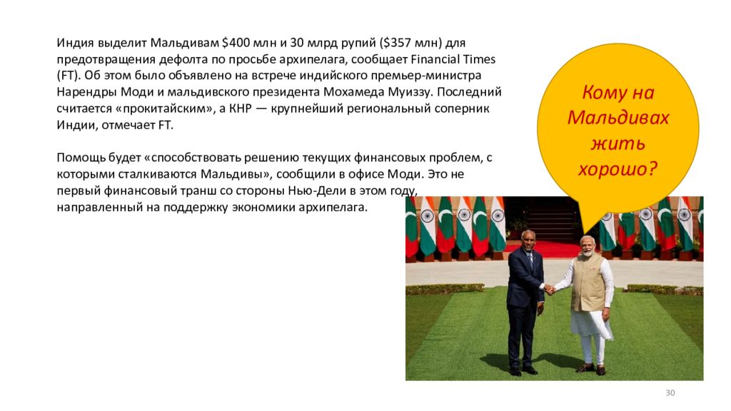 30 Индия выделит Мальдивам $400 млн и 30 млрд рупий ($357 млн) для предотвращения дефолта по просьбе архипелага, сообщает Financial Times (FT). Об этом было объявлено на встрече индийского премьер-министра Нарендры Моди и мальдивского президента Мохамеда Муиззу. Последний считается «прокитайским», а КНР — крупнейший региональный соперник Индии, отмечает FT. Помощь будет «способствовать решению текущих финансовых проблем, с которыми сталкиваются Мальдивы», сообщили в офисе Моди. Это не первый финансовый транш со стороны Нью-Дели в этом году, направленный на поддержку экономики архипелага. Кому на Мальдивах жить хорошо?
