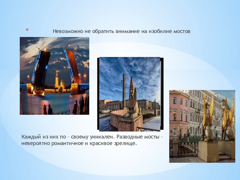Слайд 12: Каждый из них по – своему уникален. Разводные мосты – невероятно романтичное и красивое зрелище
