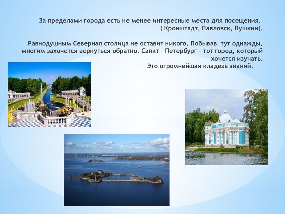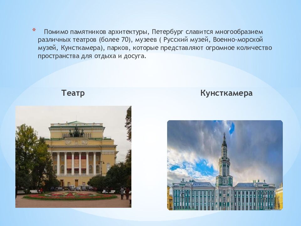 Помимо памятников архитектуры, Петербург славится многообразием различных театров (более 70), музеев ( Русский музей, Военно-морской музей, Кунсткамера), парков, которые представляют огромное количество пространства для отдыха и досуга. Театр Кунсткамера