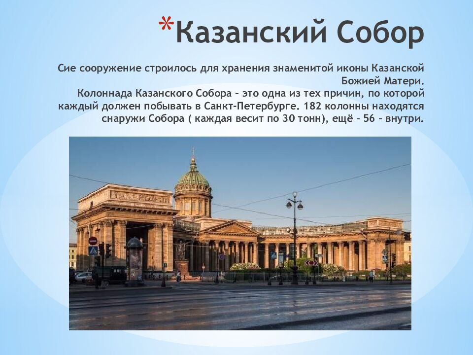 Слайд 6: Казанский Собор Сие сооружение строилось для хранения знаменитой иконы Казанской Божией Матери. Колоннада Казанского Собора – это одна из тех причин, по которой каждый должен побывать в Санкт-Петербурге. 182 колонны находятся снаружи Собора ( каждая весит по 30 тонн), ещё – 56 – внутри