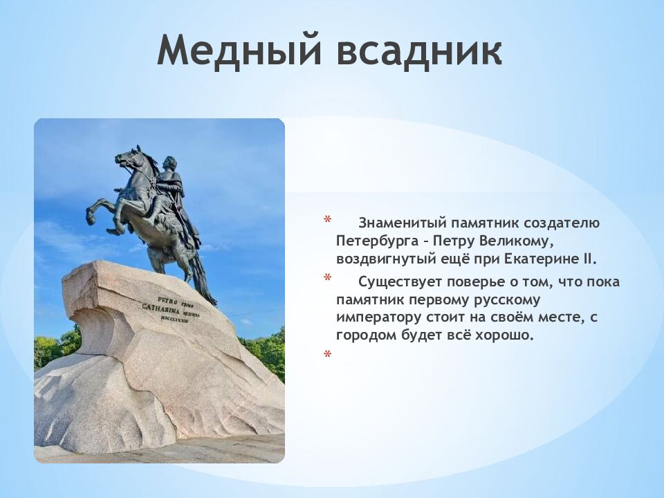 Знаменитый памятник создателю Петербурга – Петру Великому, воздвигнутый ещё при Екатерине II. Существует поверье о том, что пока памятник первому русскому императору стоит на своём месте, с городом будет всё хорошо. Медный всадник