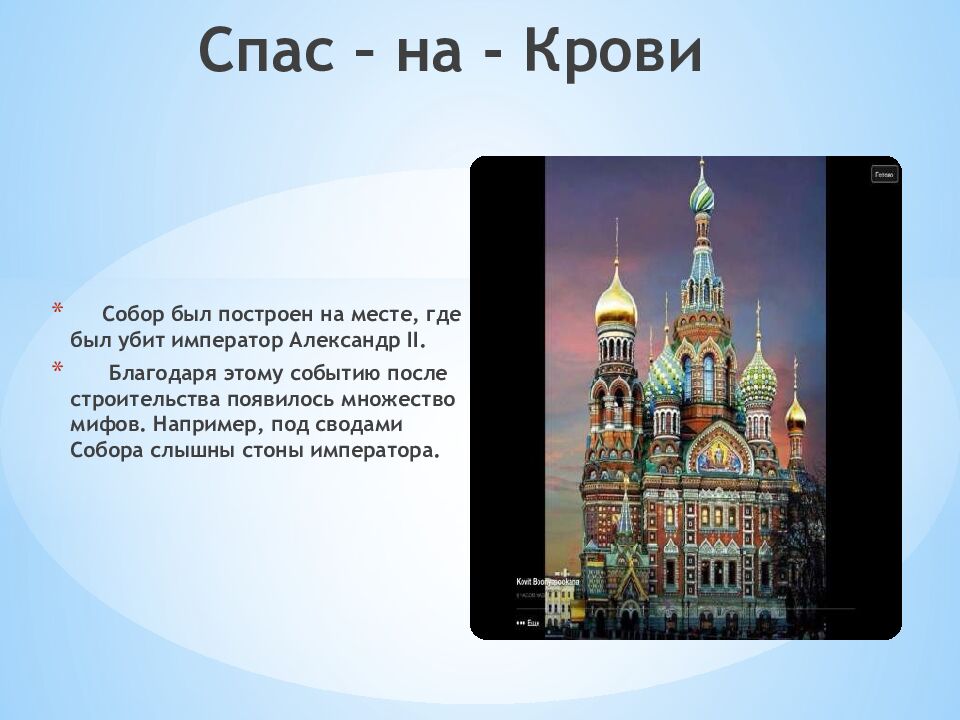 Собор был построен на месте, где был убит император Александр II. Благодаря этому событию после строительства появилось множество мифов. Например, под сводами Собора слышны стоны императора. Спас – на - Крови