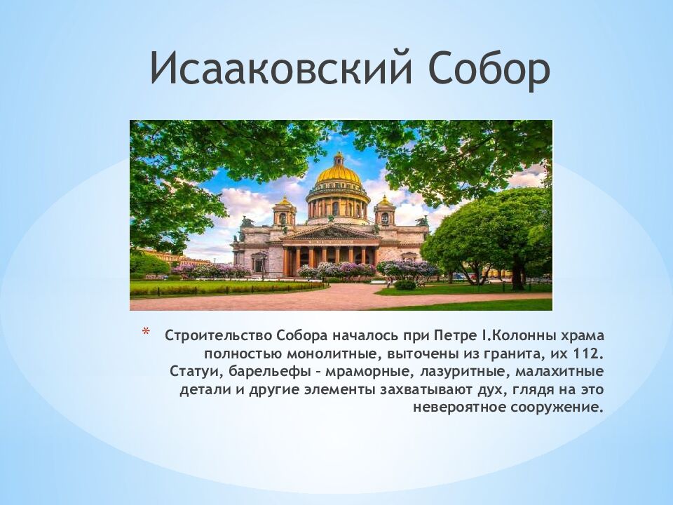 Слайд 5: Строительство Собора началось при Петре I.Колонны храма полностью монолитные, выточены из гранита, их 112. Статуи, барельефы – мраморные, лазуритные, малахитные детали и другие элементы захватывают дух, глядя на это невероятное сооружение