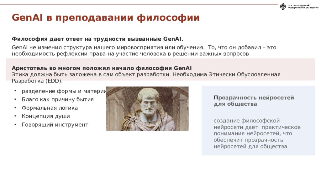 Философия дает ответ на трудности вызванные GenAI. GenAI не изменил структура нашего мировосприятия или обучения. То, что он добавил – это необходимость рефлексии права на участие человека в решении важных вопросов Аристотель во многом положил начало философии GenAI Этика должна быть заложена в сам объект разработки. Необходима Этически Обусловленная Разработка (EDD). разделение формы и материи Благо как причину бытия Формальная логика Концепция души Говорящий инструмент П розрачность нейросетей для общества создание философской нейросети дает практическое понимания нейросетей, что обеспечит прозрачность нейросетей для общества