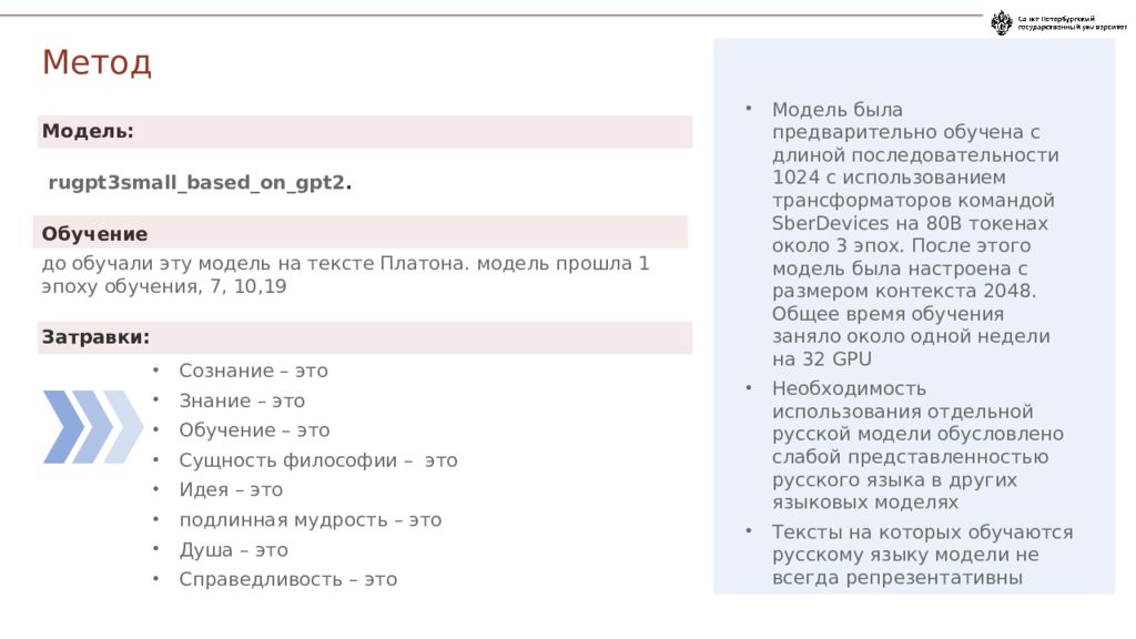 Модель: rugpt3small_based_on_gpt2. Обучение до обучали эту модель на тексте Платона. модель прошла 1 эпоху обучения, 7, 10,19 Затравки: Сознание – это Знание – это Обучение – это Сущность философии – это Идея – это подлинная мудрость – это Душа – это Справедливость – это Модель была предварительно обучена с длиной последовательности 1024 с использованием трансформаторов командой SberDevices на 80B токенах около 3 эпох. После этого модель была настроена с размером контекста 2048. Общее время обучения заняло около одной недели на 32 GPU Необходимость использования отдельной русской модели обусловлено слабой представленностью русского языка в других языковых моделях Тексты на которых обучаются русскому языку модели не всегда репрезентативны