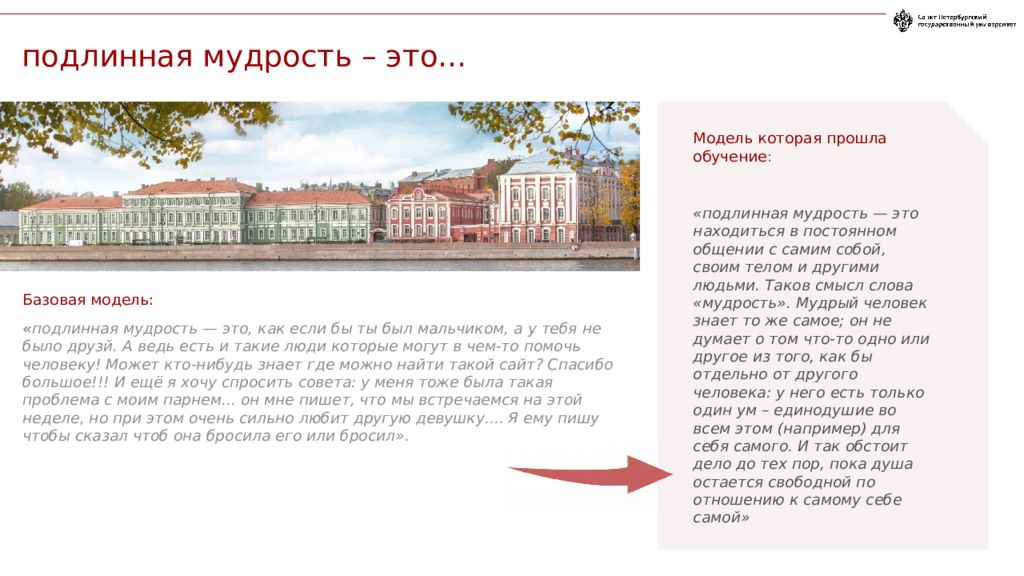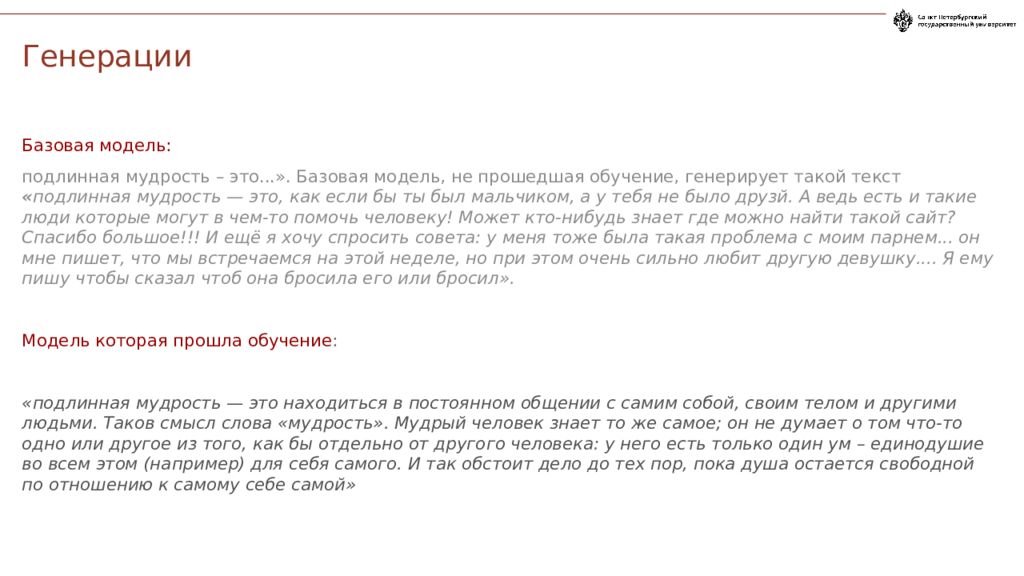 Базовая модель: подлинная мудрость – это...». Базовая модель, не прошедшая обучение, генерирует такой текст « подлинная мудрость — это, как если бы ты был мальчиком, а у тебя не было друзй. А ведь есть и такие люди которые могут в чем-то помочь человеку! Может кто-нибудь знает где можно найти такой сайт? Спасибо большое!!! И ещё я хочу спросить совета: у меня тоже была такая проблема с моим парнем... он мне пишет, что мы встречаемся на этой неделе, но при этом очень сильно любит другую девушку.... Я ему пишу чтобы сказал чтоб она бросила его или бросил». Модель которая прошла обучение : «подлинная мудрость — это находиться в постоянном общении с самим собой, своим телом и другими людьми. Таков смысл слова «мудрость». Мудрый человек знает то же самое; он не думает о том что-то одно или другое из того, как бы отдельно от другого человека: у него есть только один ум – единодушие во всем этом (например) для себя самого. И так обстоит дело до тех пор, пока душа остается свободной по отношению к самому себе самой» Генерации