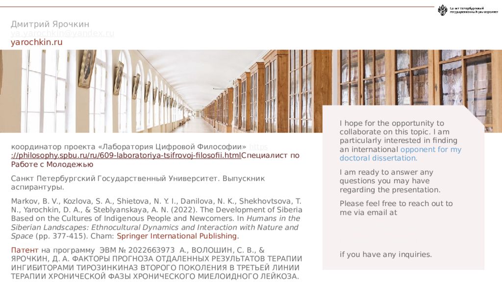 I hope for the opportunity to collaborate on this topic. I am particularly interested in finding an international opponent for my doctoral dissertation. I am ready to answer any questions you may have regarding the presentation. Please feel free to reach out to me via email at ya.yarochkin@yandex.ru d.yarochkin@spbu.ru if you have any inquiries. Дмитрий Ярочкин ya.yarochkin@yandex.ru yarochkin.ru координатор проекта «Лаборатория Цифровой Философии» https ://philosophy.spbu.ru/ru/609-laboratoriya-tsifrovoj-filosofii.html Специалист по Работе с Молодежью Санкт Петербургский Государственный Университет. Выпускник аспирантуры. Markov, B. V., Kozlova, S. A., Shietova, N. Y. I., Danilova, N. K., Shekhovtsova, T. N., Yarochkin, D. A., & Steblyanskaya, A. N. (2022). The Development of Siberia Based on the Cultures of Indigenous People and Newcomers. In Humans in the Siberian Landscapes: Ethnocultural Dynamics and Interaction with Nature and Space (pp. 377-415). Cham: Springer International Publishing. Патент на программу ЭВМ № 2022663973 А., ВОЛОШИН, С. В., & ЯРОЧКИН, Д. А. ФАКТОРЫ ПРОГНОЗА ОТДАЛЕННЫХ РЕЗУЛЬТАТОВ ТЕРАПИИ ИНГИБИТОРАМИ ТИРОЗИНКИНАЗ ВТОРОГО ПОКОЛЕНИЯ В ТРЕТЬЕЙ ЛИНИИ ТЕРАПИИ ХРОНИЧЕСКОЙ ФАЗЫ ХРОНИЧЕСКОГО МИЕЛОИДНОГО ЛЕЙКОЗА.