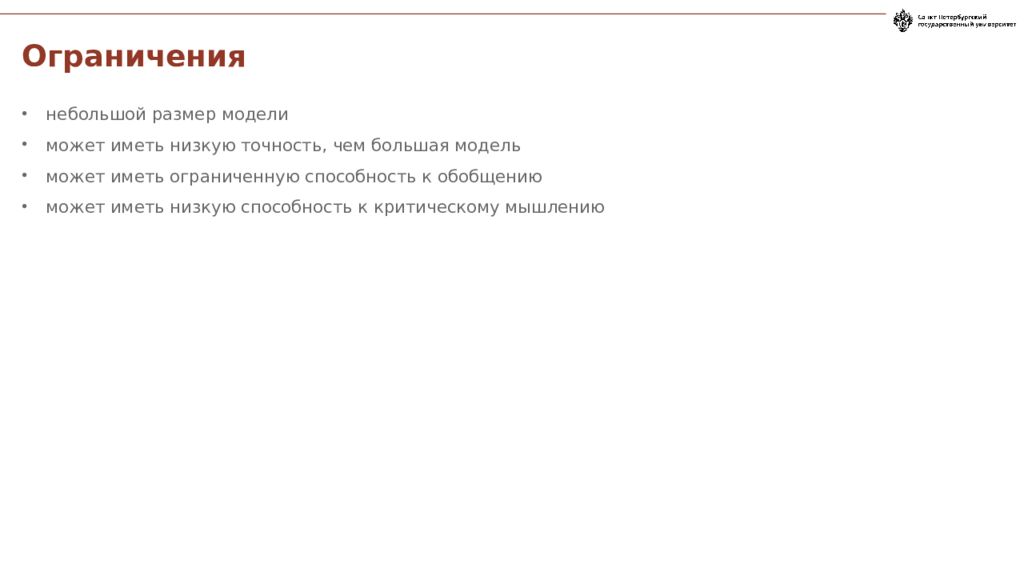 небольшой размер модели может иметь низкую точность, чем большая модель может иметь ограниченную способность к обобщению может иметь низкую способность к критическому мышлению Ограничения