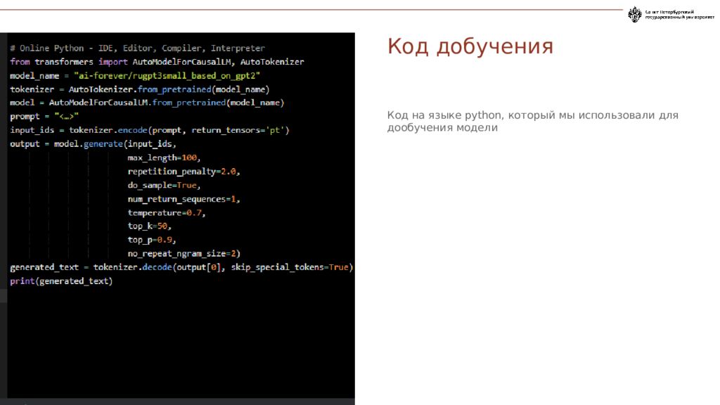 Код на языке python, который мы использовали для дообучения модели Код добучения