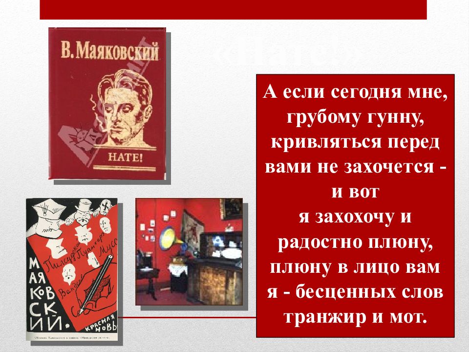 «Нате!» А если сегодня мне, грубому гунну, кривляться перед вами не захочется - и вот я захохочу и радостно плюну, плюну в лицо вам я - бесценных слов транжир и мот.
