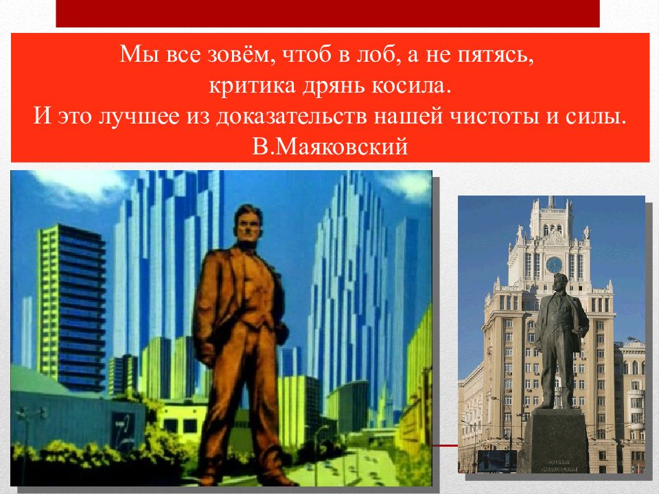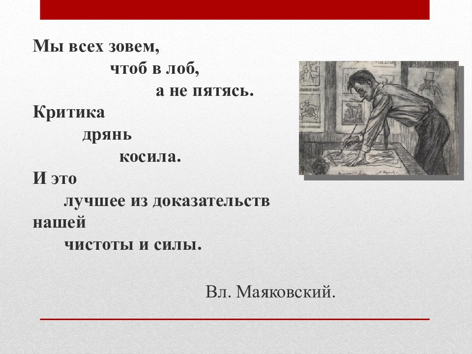 Мы всех зовем, чтоб в лоб, а не пятясь. Критика дрянь косила. И это лучшее из доказательств нашей чистоты и силы. Вл. Маяковский.