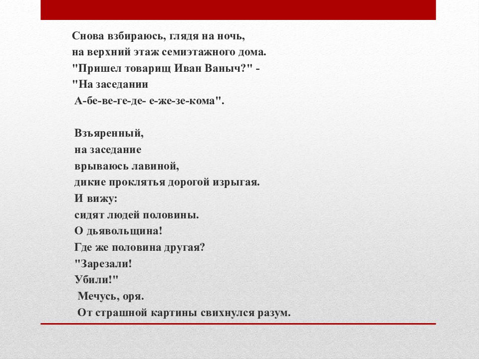 Снова взбираюсь, глядя на ночь, на верхний этаж семиэтажного дома. " Пришел товарищ Иван Ваныч ?" - " На заседании А- бе - ве - ге -де- е-же- зе -кома". Взъяренный, на заседание врываюсь лавиной, дикие проклятья дорогой изрыгая. И вижу: сидят людей половины. О дьявольщина! Где же половина другая? " Зарезали! Убили !" Мечусь, оря. От страшной картины свихнулся разум.