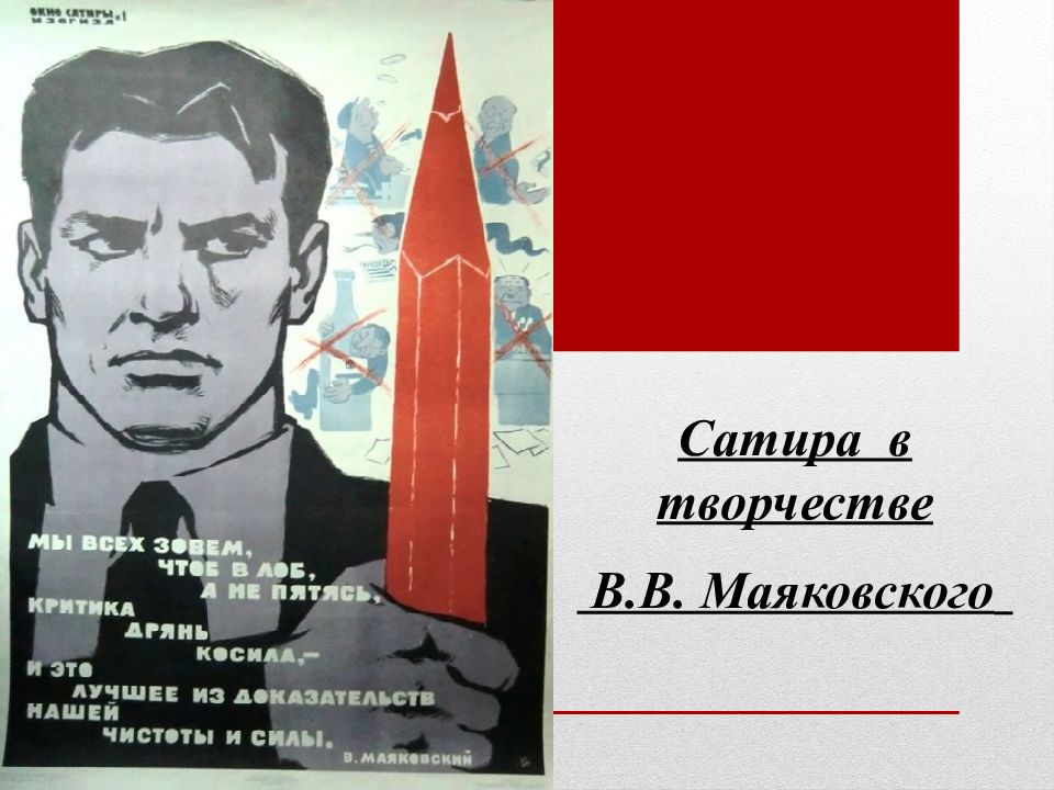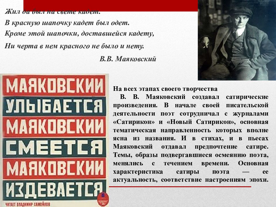 Жил да был на свете кадет. В красную шапочку кадет был одет. Кроме этой шапочки, доставшейся кадету, Ни черта в нем красного не было и нету. В.В. Маяковский На всех этапах своего творчества В. В. Маяковский создавал сатирические произведения. В начале своей писательской деятельности поэт сотрудничал с журналами «Сатирикон» и «Новый Сатирикон», основная тематическая направленность которых вполне ясна из названия. И в стихах, и в пьесах Маяковский отдавал предпочтение сатире. Темы, образы подвергавшиеся осмеянию поэта, менялись с течением времени. Основная характеристика сатиры поэта — ее актуальность, соответствие настроениям эпохи.