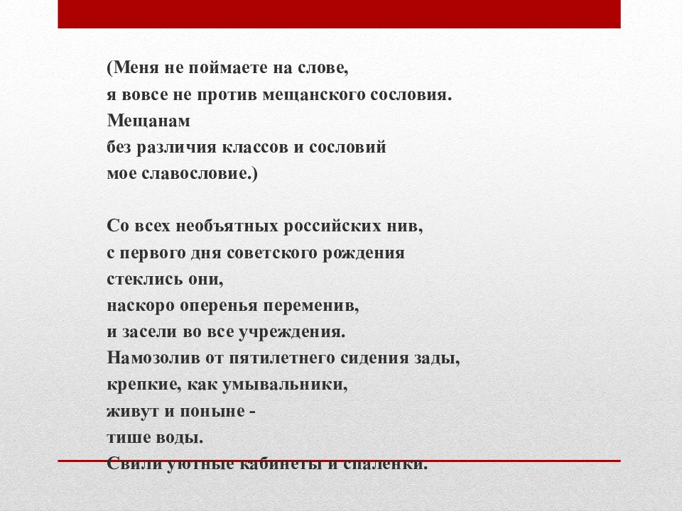 ( Меня не поймаете на слове, я вовсе не против мещанского сословия. Мещанам без различия классов и сословий мое славословие.) Со всех необъятных российских нив, с первого дня советского рождения стеклись они, наскоро оперенья переменив, и засели во все учреждения. Намозолив от пятилетнего сидения зады, крепкие, как умывальники, живут и поныне - тише воды. Свили уютные кабинеты и спаленки.