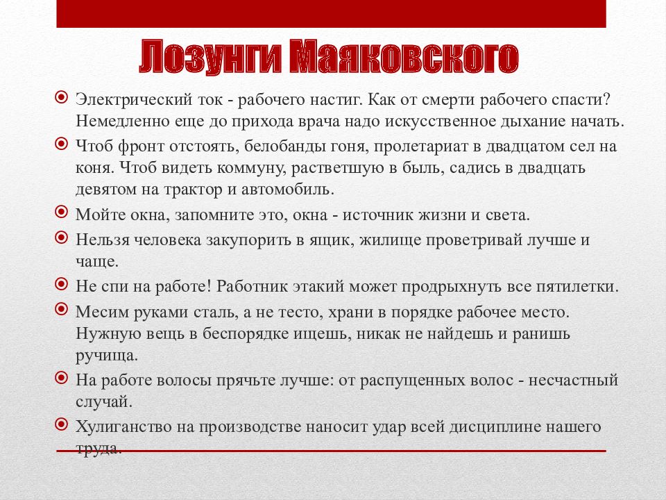Электрический ток - рабочего настиг. Как от смерти рабочего спасти? Немедленно еще до прихода врача надо искусственное дыхание начать. Чтоб фронт отстоять, белобанды гоня, пролетариат в двадцатом сел на коня. Чтоб видеть коммуну, растветшую в быль, садись в двадцать девятом на трактор и автомобиль. Мойте окна, запомните это, окна - источник жизни и света. Нельзя человека закупорить в ящик, жилище проветривай лучше и чаще. Не спи на работе! Работник этакий может продрыхнуть все пятилетки. Месим руками сталь, а не тесто, храни в порядке рабочее место. Нужную вещь в беспорядке ищешь, никак не найдешь и ранишь ручища. На работе волосы прячьте лучше: от распущенных волос - несчастный случай. Хулиганство на производстве наносит удар всей дисциплине нашего труда.