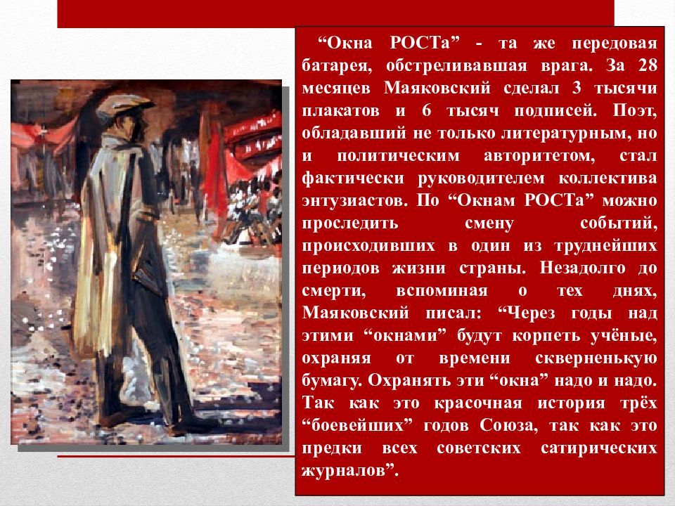 “Окна РОСТа” - та же передовая батарея, обстреливавшая врага. За 28 месяцев Маяковский сделал 3 тысячи плакатов и 6 тысяч подписей. Поэт, обладавший не только литературным, но и политическим авторитетом, стал фактически руководителем коллектива энтузиастов. По “Окнам РОСТа” можно проследить смену событий, происходивших в один из труднейших периодов жизни страны. Незадолго до смерти, вспоминая о тех днях, Маяковский писал: “Через годы над этими “окнами” будут корпеть учёные, охраняя от времени скверненькую бумагу. Охранять эти “окна” надо и надо. Так как это красочная история трёх “боевейших” годов Союза, так как это предки всех советских сатирических журналов”.