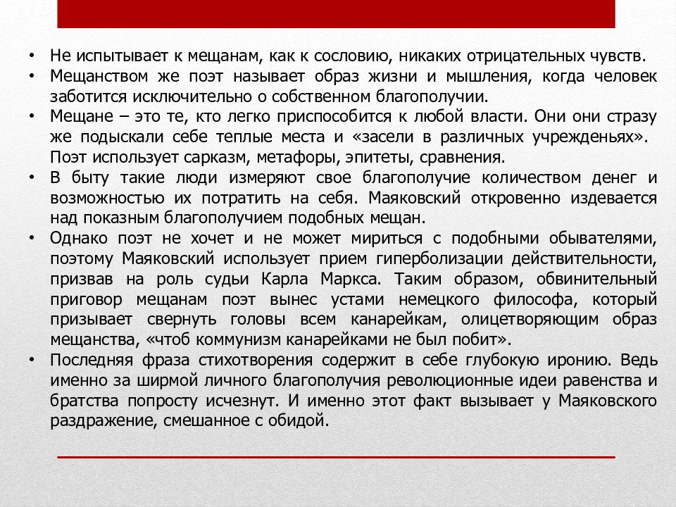 Не испытывает к мещанам, как к сословию, никаких отрицательных чувств. Мещанством же поэт называет образ жизни и мышления, когда человек заботится исключительно о собственном благополучии. Мещане – это те, кто легко приспособится к любой власти. Они они стразу же подыскали себе теплые места и «засели в различных учрежденьях». Поэт использует сарказм, метафоры, эпитеты, сравнения. В быту такие люди измеряют свое благополучие количеством денег и возможностью их потратить на себя. Маяковский откровенно издевается над показным благополучием подобных мещан. Однако поэт не хочет и не может мириться с подобными обывателями, поэтому Маяковский использует прием гиперболизации действительности, призвав на роль судьи Карла Маркса. Таким образом, обвинительный приговор мещанам поэт вынес устами немецкого философа, который призывает свернуть головы всем канарейкам, олицетворяющим образ мещанства, «чтоб коммунизм канарейками не был побит». Последняя фраза стихотворения содержит в себе глубокую иронию. Ведь именно за ширмой личного благополучия революционные идеи равенства и братства попросту исчезнут. И именно этот факт вызывает у Маяковского раздражение, смешанное с обидой.