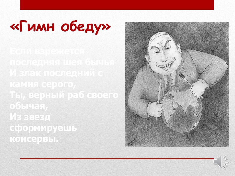 «Гимн обеду» Если взрежется последняя шея бычья И злак последний с камня серого, Ты, верный раб своего обычая, Из звезд сформируешь консервы.
