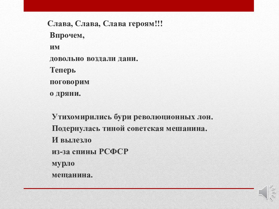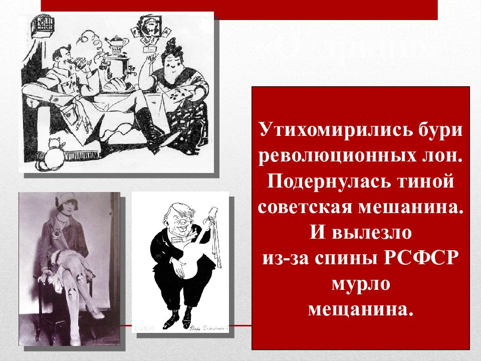 Слава, Слава, Слава героям!!! Впрочем, им довольно воздали дани. Теперь поговорим о дряни. Утихомирились бури революционных лон. Подернулась тиной советская мешанина. И вылезло из-за спины РСФСР мурло мещанина.