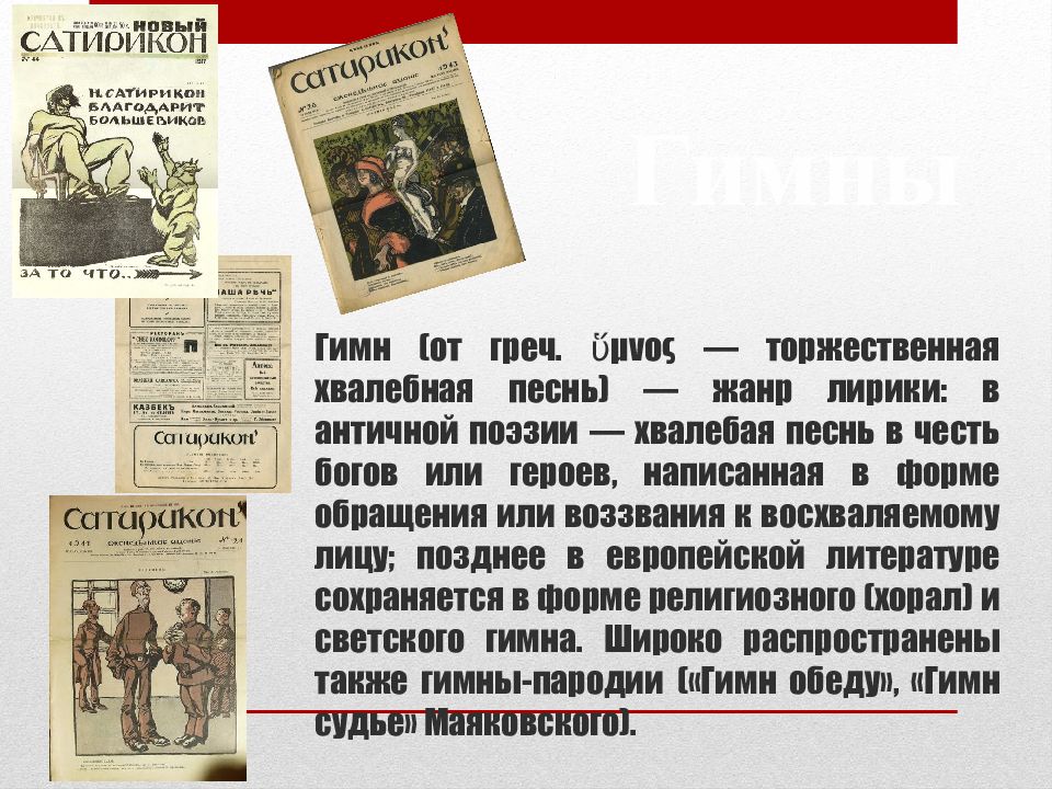 Гимн (от греч. ὕμνος — торжественная хвалебная песнь) — жанр лирики: в античной поэзии — хвалебая песнь в честь богов или героев, написанная в форме обращения или воззвания к восхваляемому лицу; позднее в европейской литературе сохраняется в форме религиозного (хорал) и светского гимна. Широко распространены также гимны-пародии («Гимн обеду», «Гимн судье» Маяковского). Гимны
