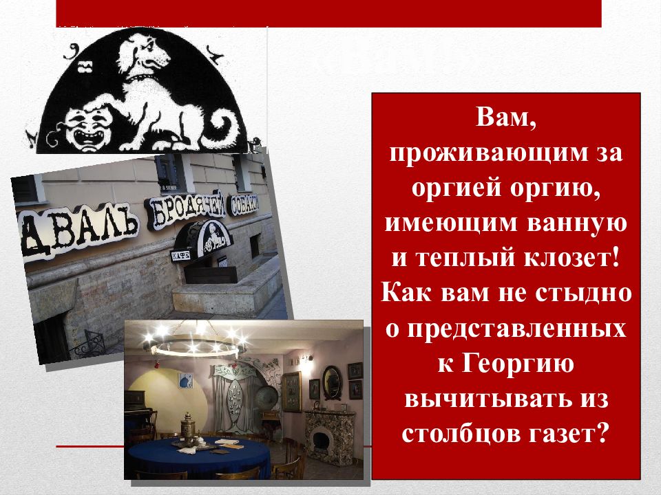 «Вам!» Вам, проживающим за оргией оргию, имеющим ванную и теплый клозет! Как вам не стыдно о представленных к Георгию вычитывать из столбцов газет?