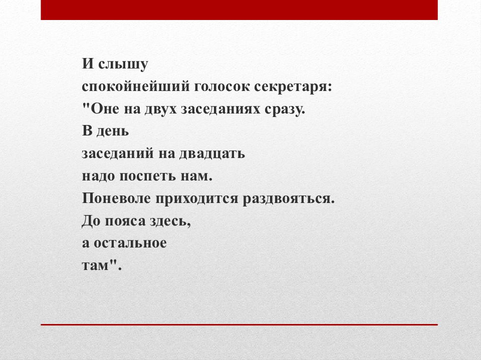 И слышу спокойнейший голосок секретаря: "Оне на двух заседаниях сразу. В день заседаний на двадцать надо поспеть нам. Поневоле приходится раздвояться. До пояса здесь, а остальное там".