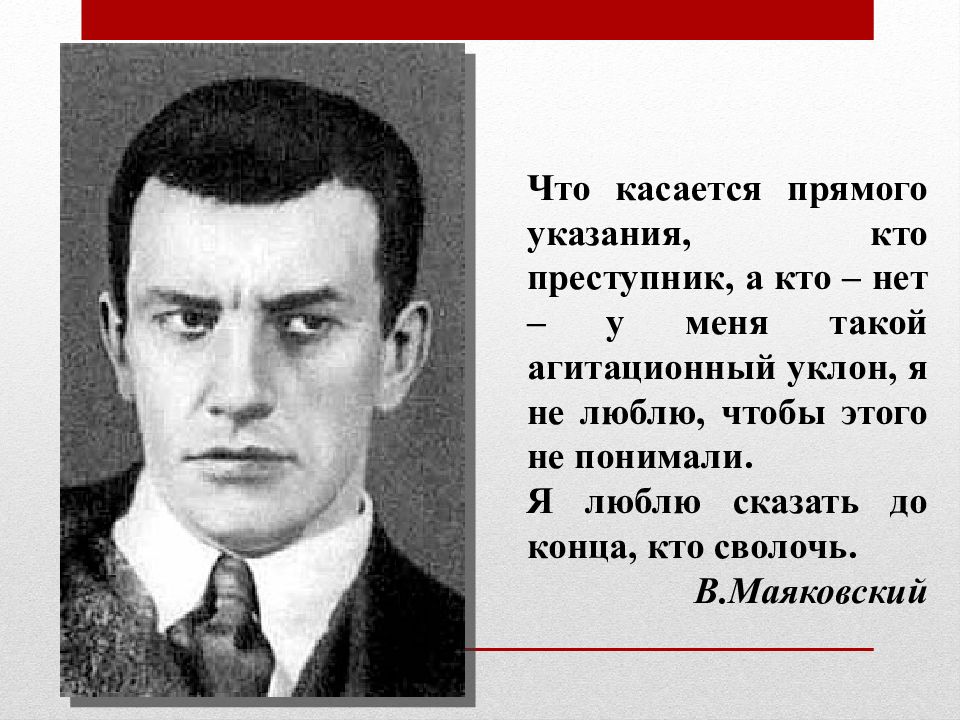 Что касается прямого указания, кто преступник, а кто – нет – у меня такой агитационный уклон, я не люблю, чтобы этого не понимали. Я люблю сказать до конца, кто сволочь. В.Маяковский