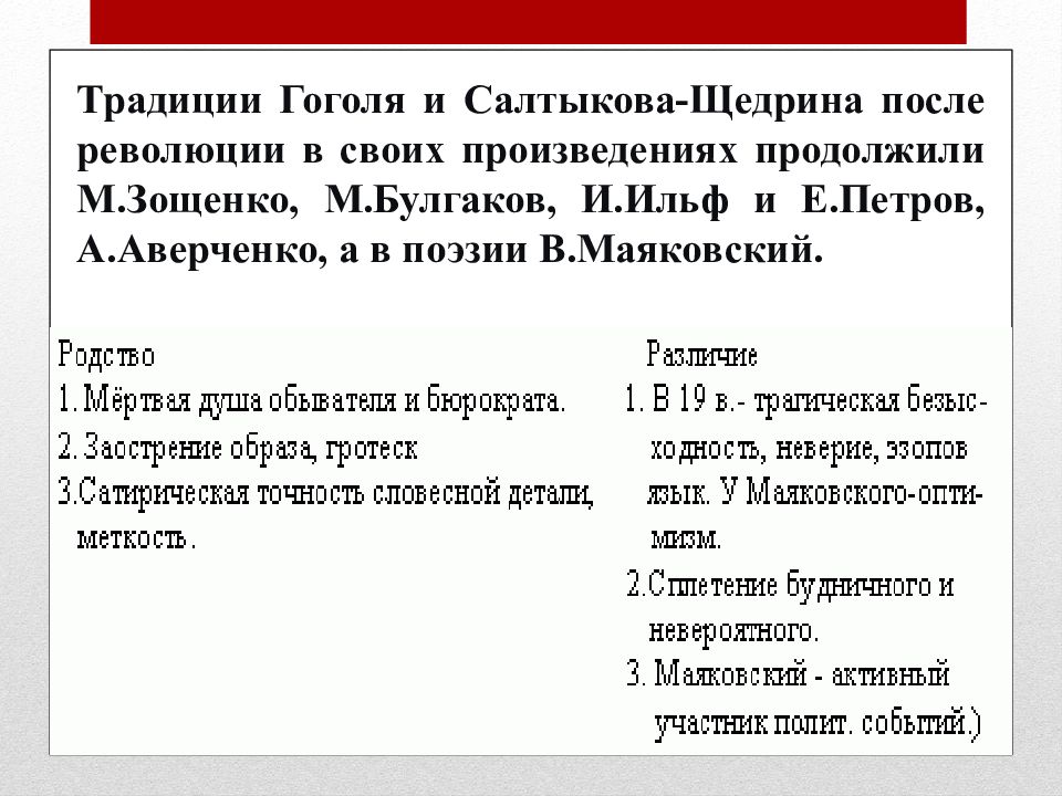 Традиции Гоголя и Салтыкова-Щедрина после революции в своих произведениях продолжили М.Зощенко, М.Булгаков, И.Ильф и Е.Петров, А.Аверченко, а в поэзии В.Маяковский.