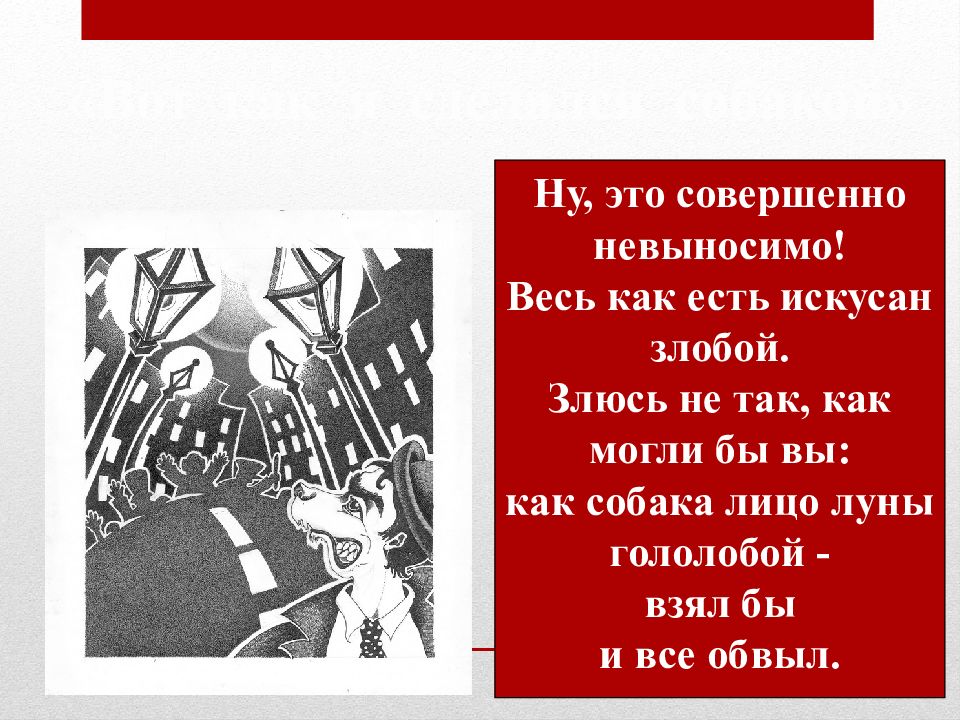 «Вот как я сделался собакой» Ну, это совершенно невыносимо! Весь как есть искусан злобой. Злюсь не так, как могли бы вы: как собака лицо луны гололобой - взял бы и все обвыл.