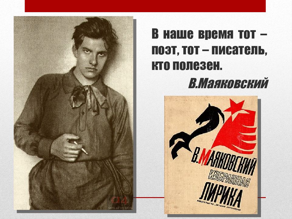 Всем своим творчеством Маяковский был устремлен в будущее. Его боевое оружие – это перо, и своим творчеством поэт пробуждал светлые чувства в человеке, помогал бороться с тем, что мешало жить. Свое поэтическое кредо Маяковский выразил в стихотворении «Необычайное приключение, бывшее с Владимиром Маяковским летом на даче»: Светить всегда, светить везде, до дней последних донца, светить – и никаких гвоздей! Вот лозунг мой – и солнца! Эти строки вошли в сознание миллионов людей, как эпиграф ко всему творчеству Маяковского.