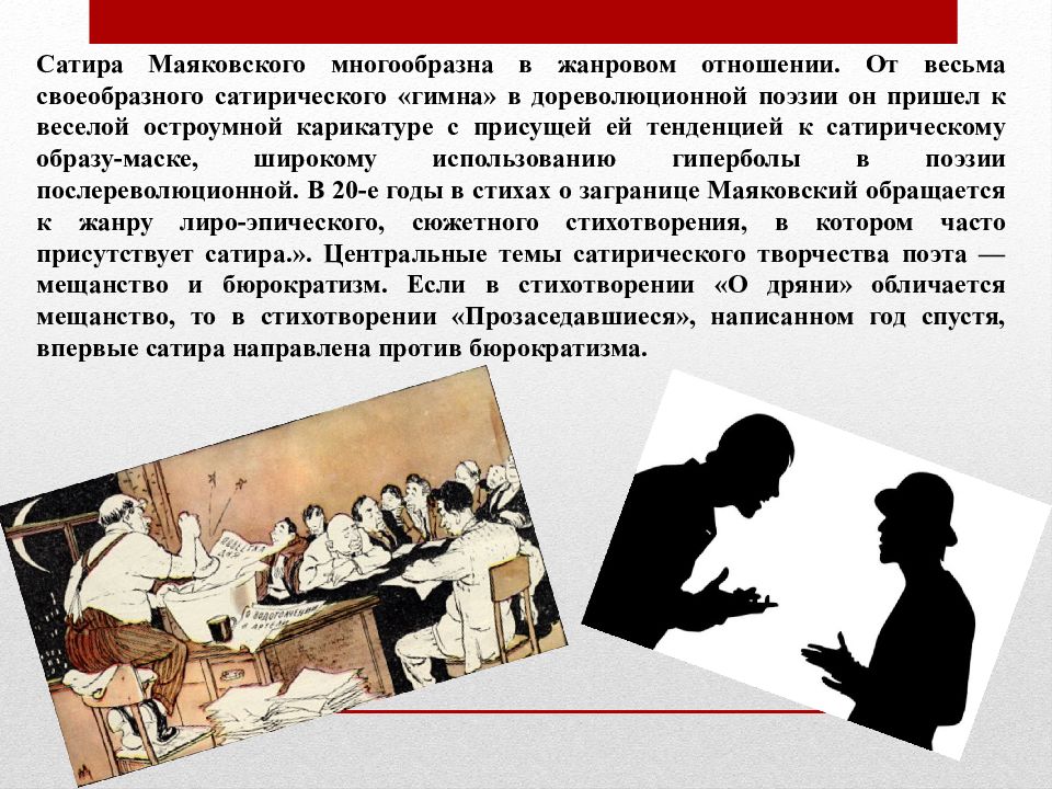 Сатира Маяковского многообразна в жанровом отношении. От весьма своеобразного сатирического «гимна» в дореволюционной поэзии он пришел к веселой остроумной карикатуре с присущей ей тенденцией к сатирическому образу-маске, широкому использованию гиперболы в поэзии послереволюционной. В 20-е годы в стихах о загранице Маяковский обращается к жанру лиро-эпического, сюжетного стихотворения, в котором часто присутствует сатира.». Центральные темы сатирического творчества поэта — мещанство и бюрократизм. Если в стихотворении «О дряни» обличается мещанство, то в стихотворении «Прозаседавшиеся», написанном год спустя, впервые сатира направлена против бюрократизма.