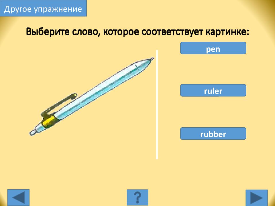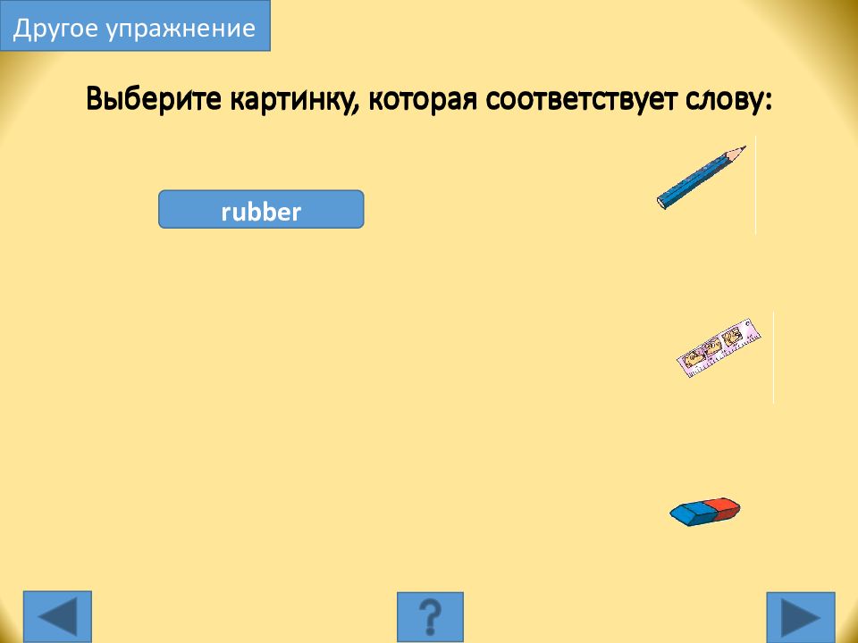pen ruler rubber Выберите слово, которое соответствует картинке: Другое упражнение
