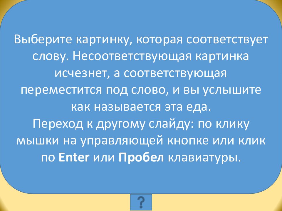 Выберите картинку, которая соответствует слову. Несоответствующая картинка исчезнет, а соответствующая переместится под слово, и вы услышите как называется эта еда. Переход к другому слайду: по клику мышки на управляющей кнопке или клик по Enter или Пробел клавиатуры.